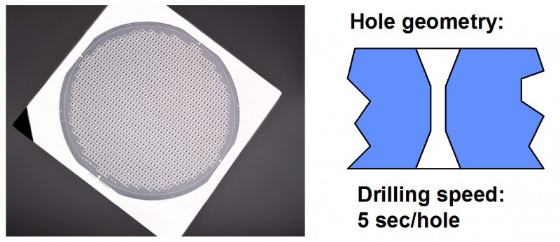 由於(yu) 加工中剝離出來的玻璃粉塵不影響到激光束,避免了粉塵引起的等離子體(ti) 激發過程,進而避免了對加工質量的影響,從(cong) 而保證加工的高度精確和可重複性;孔的深寬比可以分別獨立選擇而幾乎不受任何限製,也不會(hui) 有精度上的損失;正如圖中所示的高寬比達到50的孔,深寬比更大的孔也能容易實現;孔的橫載麵可以沿著孔的深度方向變化,孔的中部被展寬,形成類似金字塔樣的結構,而這也是其它加工手段所無法實現的。通過層層剝離切割,可以在玻璃或類似玻璃的材料中加工出幾乎任意一種三維結構。超精玻璃鑽孔, 橫截麵隨深度變化的孔(圖所示樣品的孔中添加了彩色液體(ti) 以易於(yu) 觀察)。