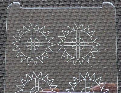 上圖所示的是鑽有1000多個錐形孔,厚為2mm的玻璃晶元樣品,鑽孔速度為5秒/孔。全尺寸的觸摸屏麵板切割,以及三維結構的太陽能玻璃聚光器的切割,也可以通過逐層掃描切割實現。下圖是玻璃切割的樣品。以厚度為0.7mm的觸摸屏玻璃切割為例,等效切割線速度可以達到10mm/s。