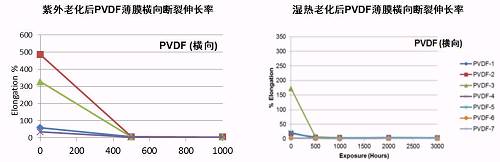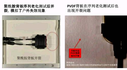 舉例來說,以序列老化測試對PVDF背板以及PVF背板進行序列老化測試後,PVDF背板出現了開裂現象,這就說明了由於PVDF薄膜橫向力學性能不佳,在老化後容易變脆,在冷熱循環應力下容易朝單一方向開裂;而PVF薄膜因為是雙向拉伸的成膜技術,所以不會有這種問題。