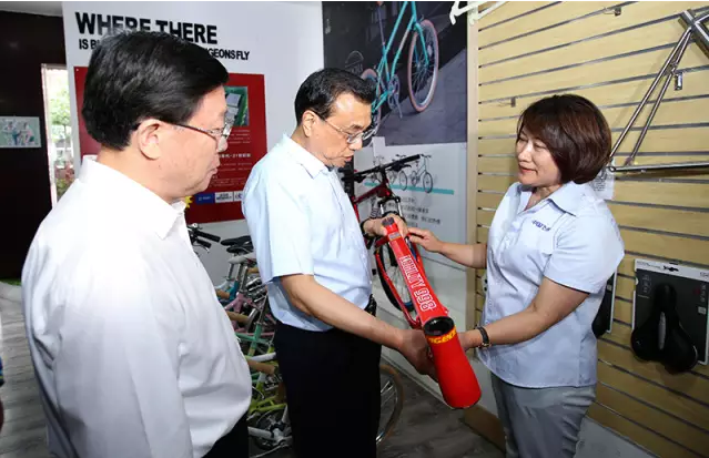 6月26日,李克強來到飛鴿自行車天津勝利路體驗店。這裏擺放著不同檔次、材質和性能各異的自行車。總理來到一輛碳纖維自行車前掂了掂重量,又親自體驗了一下這輛超級智能自行車的性能。他說,我願為中國自行車做廣告,更願為“中國製造”智能升級“站台”。總理還說,希望你們打造中國傳統企業的“百年老店”。發揚勇於創新的企業家精神,追求精益求精的工匠精神,讓老樹不斷發新芽,更加枝繁葉茂。