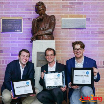 慕尼黑工業大學研究人員(從左到右)Fabian Steiner, Georg Böcherer, 和Patrick Schulte與信息論之父克勞德香農(Claude Shannon)的雕像合影。