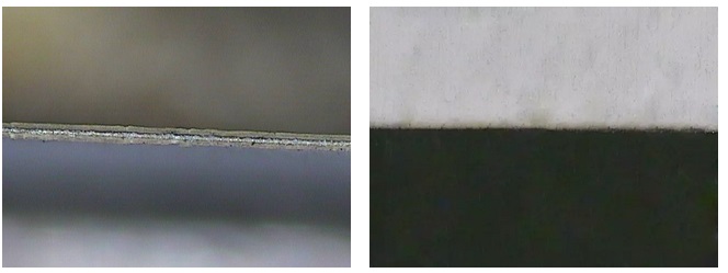 正極陶瓷層中間為(wei) 鋁箔,兩(liang) 邊為(wei) 白色絕緣陶瓷層,厚度100μm,切縫層次明顯,棱角分明,邊緣整齊無掛渣。熱影響區域小於(yu) 0.03mm