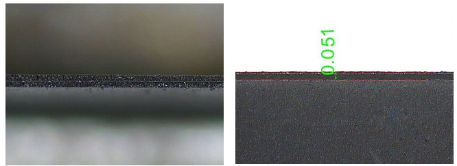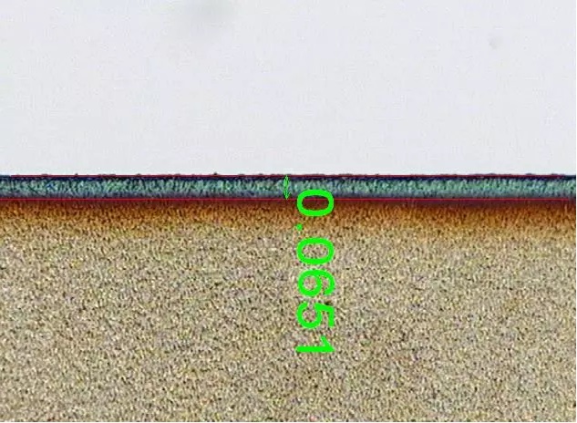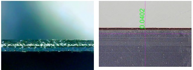 負極極片中間為(wei) 銅箔,兩(liang) 邊為(wei) 電鍍石墨層,切縫層次分明,邊緣平整,無熔珠,熱影響區域小於(yu) 0.051mm厚度80μm