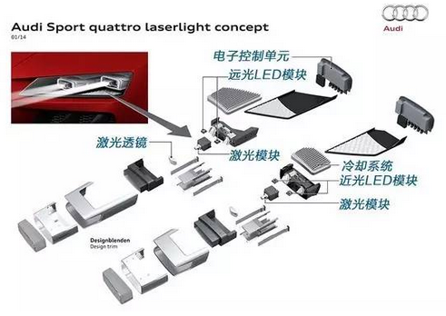 下麵我們(men) 先來看看在車燈方麵的應用情況。根據相關(guan) 測試,激光燈的優(you) 勢在於(yu) 如可以通過一個(ge) 鏡片控製激光光束的方向,實現靈活照明,可以有指向性的照射到前方,距離是LED遠光燈的兩(liang) 倍。在2014年1月初開幕的美國拉斯維加斯消費電子展上,奧迪就曾發布了SportLaserlightconcept概念車,這也是奧迪首款搭載激光大燈的車型,也預示著奧迪激光大燈的投入使用。