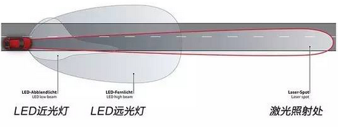 激光大燈的照射範圍是LED遠光燈的兩(liang) 倍,與(yu) LED照明係統起互補作用