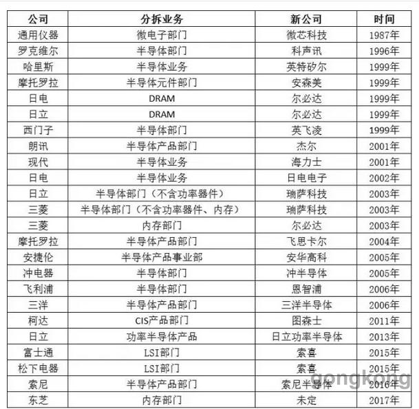 圖1:全球部分綜合性IDM公司半導體業務分拆情況