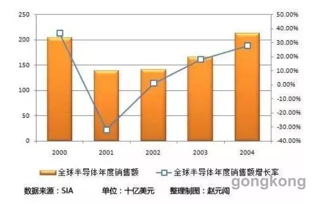 20世紀90年代隨著互聯網的到來,改變了人類對以往科技的認知,互聯網公司如雨後春筍般湧現,加上資本市場的瘋狂追逐,最終在千禧年後,互聯網泡沫破裂,一切回歸平靜, 2000年的全球半導體銷售額增長率達到37%(從1986年以來的第二高的增長率),突破2000億美元關口。但隨著泡沫的破裂,2001年出現了斷崖式的下降,全球半導體出現了30%的驚人降幅,甚至在往後的三年都處於低迷期,直到2004年全球半導體市場才開始恢複增長。