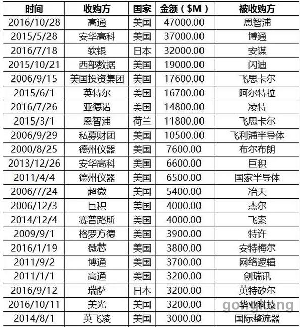 1、中國對於半導體行業的雄心壯誌。中國政府在2014年發布了《國家集成電路產業發展推進綱要》,要提升在全球產業競爭格局中的地位和影響力。以全球產業發展趨勢和國內產業基礎為出發點,提出了2015年、2020年和2030年三個階段的產業發展目標,到2015年,機製體製創新取得成效,建立與集成電路產業規律相適應的管理決策體係、融資平台和政策環境。到2020年,逐步縮小與國際先進水平的差距,基本建成技術先進、安全可靠的集成電路產業體係。到2030年,產業總體達到國際先進水平,實現跨越發展。總之就是要減少IC器件的進口量,直到自給自足。這一目標的提出,推動了一些中國企業和投資集團的收購熱情。
