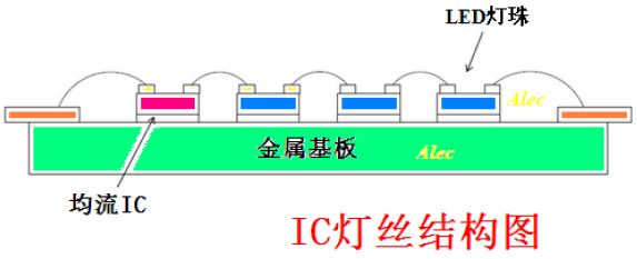 IC 燈絲是直接將恒流IC 芯片綁定在燈絲基板上,恒流IC 在燈絲基板上與N顆LED 燈珠芯片直接串聯成一體,成為有自控燈絲電流的新型電子LED 燈絲。