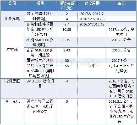 2016年10月11日,國星光電公告稱擬投入不超過4億元進行公司封裝項目的擴產,此次擴產項目建設周期為2016年12月到2017年6月。