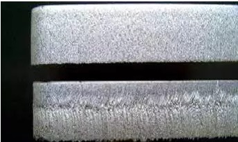 下圖展示的是10mm 不鏽鋼采用調製(上方)方式和無調製(下方)方式切割樣件的效果對比。