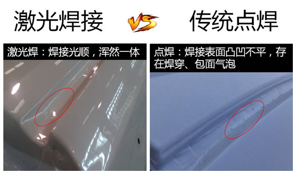 焊接質量更好,激光焊采用熱熔焊絲(si) 填充縫隙的技術,焊接後車身鈑金材料整體(ti) 貼合,焊接表麵光順一體(ti) ,整體(ti) 焊接質量極其優(you) 秀。普通的點焊雖然焊接成本低,但焊接後存在有焊瘤、焊穿、包麵氣孔氣泡的潛在焊接缺陷。