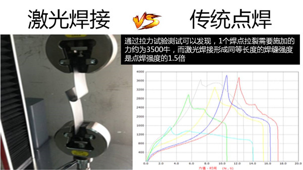 激光焊接部位強度更高,通過拉力試驗測試可以發現,1個(ge) 焊點拉裂需要施加的力約為(wei) 3500牛,激光焊接形成同等長度的焊縫強度是點焊強度的1.5倍。