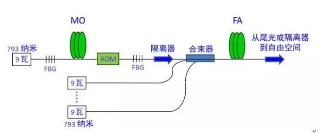 從理論上講,摻銩 (Tm3+) 光纖可以有許多泵浦波長。這裏介紹的激光器使用公認的波長為 793 nm 的最佳泵浦方法,適合這個波長的高功率 InGaAs 泵浦二極管產品非常成熟。Tm3+ 光纖激光器主要組件的示意圖如圖 2 所示。主振蕩器 (MO) 采用光纖布拉格光柵 (FGB),並且將聲光調製器 (AOM) 用作重複頻率最高為100 kHz 的調 Q 脈衝。這個振蕩器由一個單管光纖耦合激光二極管(Coherent | DILAS,793 nm 模塊)泵浦,通過光纖合束器將多個相同的激光二極管來泵浦光纖放大器。