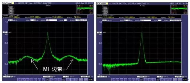 圖 3.消除調製不穩定性。主振蕩器 (MO) 輸出光譜在光纖長度優化前(左圖)後(右圖)的對比。在左圖中,中心頻率周圍顯示兩條由 MI 造成的邊帶。