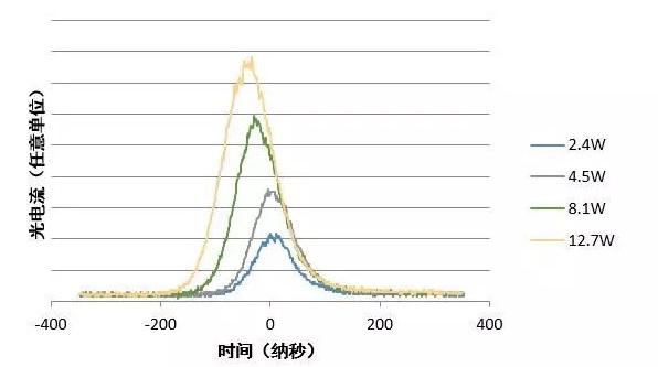 圖 4.在四種輸出功率電平下測試的 FA 脈衝定時結果顯示由高增益帶來的脈衝展寬。