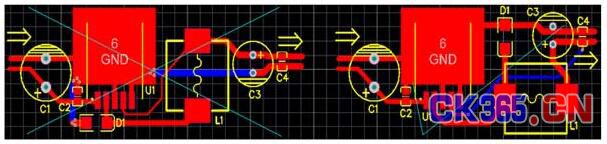 開關(guan) 電源PCB設計時,需要注意的地方是:反饋線的引入點、續流二極管是給誰續流。從(cong) 圖三可以看出,U1導通時,電流I2進入電感L1,電感的特性是電流在電感裏流過時不能突然產(chan) 生,也不能突然消失,電流在電感裏的變化時有一個(ge) 時間過程的。在脈衝(chong) 電流I2流過電感的作用下,有部分電能轉換成磁能,電流逐漸增大,到一定時候,控製電路U1關(guan) 斷了I2,由於(yu) 電感的特性,電流不能突然消失,這時候二極管起作用了,它接替電流I2,所以叫續流二極管,可以看出,續流二極管是給電感用的,續流的電流I3是從(cong) C3的負端出發,經D1,L1後流入C3的正端,這裏就相當於(yu) 抽水機,利用電感的能量,把電容C3的電壓提高了。還有就是電壓檢測的反饋線引入點問題,應該是經過濾波後的地方反饋回去,不然會(hui) 使輸出的電壓紋波更大。這兩(liang) 點是我們(men) 很多PCB設計人員經常忽視的地方,以為(wei) 同一個(ge) 網絡,接在那兒(er) 不是一樣,其實接的地方不一樣,性能影響是很大的。圖四是LM2575開關(guan) 電源PCB圖,大家看看錯的那幅圖是哪裏錯了。