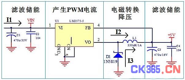 圖三 LM2575開關(guan) 電源電路原理圖