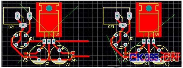 PCB設計時,元件的布局要緊湊,要讓所有的連線盡可能短,要按原理圖元件功能關係去布局元件與走線。本電源圖裏就是先整流、再濾波、濾波後才是穩壓、穩壓後才是儲能電容、流經電容後才給後麵的電路用電。圖二是上麵原理圖的PCB圖,兩個圖相似。左圖和右圖就是走線有點不一樣,左圖的電源經整流後直接就到了穩壓芯片的輸入腳了,然後才是穩壓電容,這裏電容所起的濾波效果就差了很多,輸出也有問題。右圖就是比較好的圖了。我們不僅要考慮正電源的流向問題,還必須考慮地回流問題,一般來說,正電源線和地回流線要盡可能同進同出,彼此離近點。