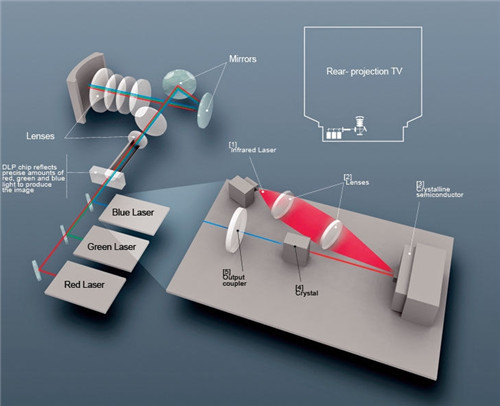 一個(ge) 激光器總是發射確定波長和顏色的光線,可以通過在激光器前麵安裝專(zhuan) 門的晶體(ti) 或光導生成紅綠藍顏色,然後在這些材料內(nei) 通過所謂的聚焦將激光轉化成期望的顏色。放映時,將紅綠藍數據送到激光單元內(nei) 部的調製解調器上,視頻數據通過調幅轉換成光學信息,帶有紅綠藍光線的三分射線組合成單一的激光射線,而包含所有圖像信息的激光束再通過光纜送到放映頭,最後投射到銀幕上。