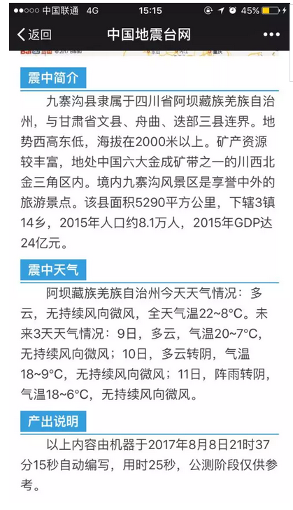 2017年8月8日,四川阿壩藏族羌族自治州九寨溝縣發生7.0級地震。然而,小編在心係四川同胞安危的同時發現,在地震發生後的十幾分鍾後(即8月8日21時37分15秒),中國地震台網機器人自動完成稿件編寫,全程僅用25秒便出稿540字,並配發4張圖片,內容包含速報參數、震中地形、熱力人口、周邊村鎮、周邊縣區、曆史地震、震中簡介、震中天氣8大項。