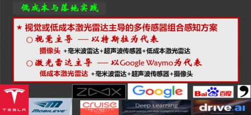 據清華大學鄧誌東(dong) 教授介紹,自動駕駛環境感知的技術路線主要有兩(liang) 種:一種是以特斯拉為(wei) 代表的視覺主導的多傳(chuan) 感器融合方案,另一種以低成本激光雷達為(wei) 主導,典型代表如穀歌Waymo。