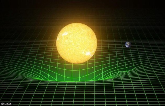 圖中綠色格線代表太陽和地球造成的時空彎曲。愛因斯坦曾在1916年提出的廣義(yi) 相對論中描述過這一效應。