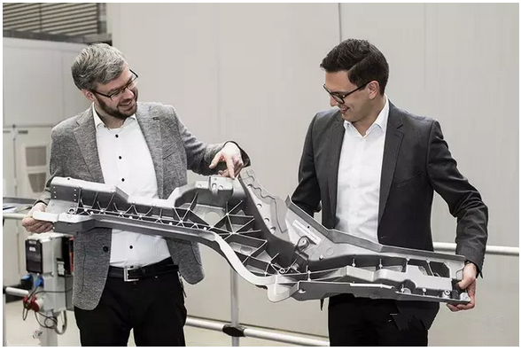 圖示為(wei) 新一代奧迪A8的後縱梁,該部件采用壓鑄工藝,是整個(ge) 車身最大的鑄鋁部件,同時後縱梁布置了大量的仿生學肋條式設計,強度相比現款車型增加50%。