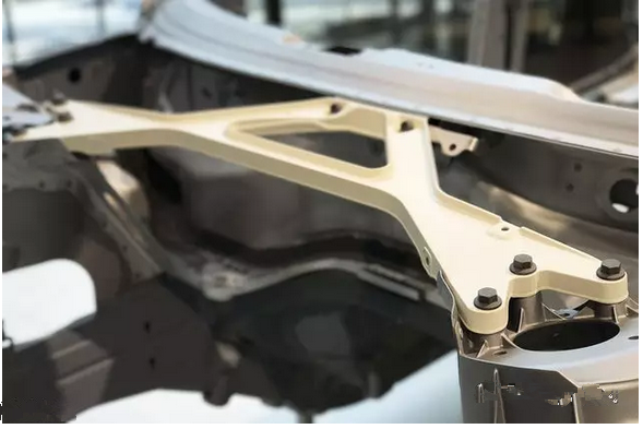 發動機艙支架采用了鑄鎂合金材質,剛度性能出色,密度相比現款A8的鋁製部件降低45%,重量減輕28%,減重大概500g左右。塔頂位置采用了鑄造鋁合金,厚度比較薄,但是強度完全滿足要求。