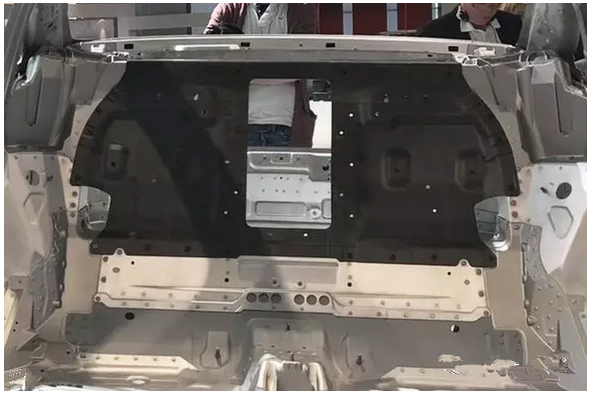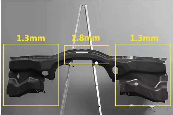 整個(ge) 前防火牆其實是由三塊不同厚度的熱成型超高強度鋼焊接在一起的,其中兩(liang) 側(ce) 鋼板厚度為(wei) 1.3mm,中間鋼板厚度為(wei) 1.8mm,這樣可以在保障安全性的同時降低防火牆重量。