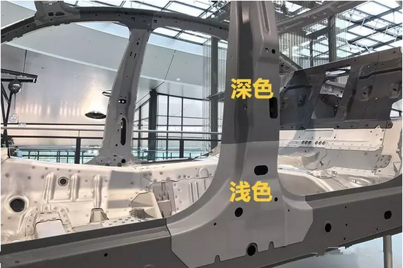 整個(ge) B柱雖然是由一整塊鋼板組成,但是我們(men) 可以明顯看到上下分為(wei) 深色和淺色。這是因為(wei) B柱上下部分冷卻溫度和冷卻時長不同。深色部分強度更高一些,淺色部分強度稍弱。