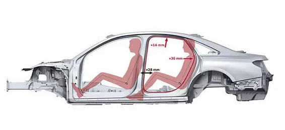 這種複合型連接方式可以讓A柱變得更細,駕駛員在車內(nei) 的視野更好,同時C柱變細,後門開口更大,高度提升14mm,寬度增加36mm,後排乘客腿部空間增加28mm,後排乘客上下車更方便。