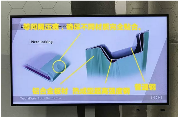 在車輛B柱位置,新一代奧迪A8在材料連接上應用了卷邊及黏貼封邊技術,這種冷連接方式可以將不同材質有效地固定在一起。