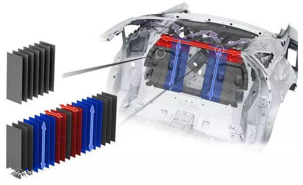 關(guan) 於(yu) 這塊碳纖維背板再多說兩(liang) 句,奧迪將其稱之為(wei) 增強型碳纖維複合材料。這塊背板由多層碳纖維布料組成,碳纖維布料中纖維編織方向不同,使得整塊麵板受力更加均勻。