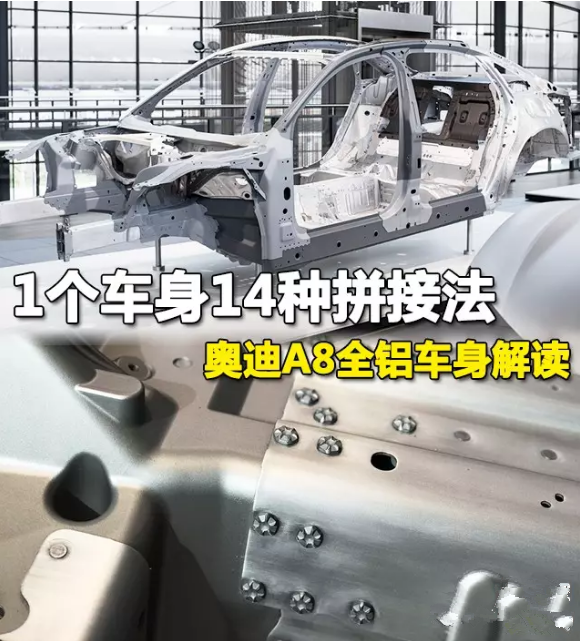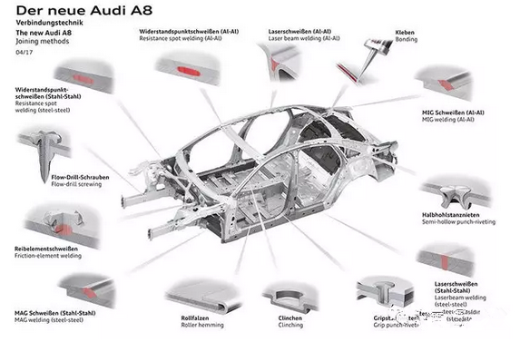 好在自家跑車奧迪R8也同樣采用多種車身材質,為(wei) 新一代奧迪A8提供了參考方案。解決(jue) 好不同材料之間的連接問題是關(guan) 鍵,自切削螺釘聯接、激光焊接、鉚接等技術大量應用在車身上。