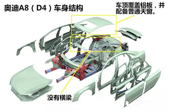 其實這一點可以在現款奧迪A8車型上得到驗證,從(cong) 這張車身示意圖不難看出,奧迪A8車型車頂沒有出現橫梁,其車頂覆蓋了鋁板,並配備普通天窗,而不是配備全景天窗。