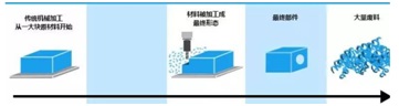 傳(chuan) 統零件製備工藝主要是減材製造。從(cong) 一塊原材料開始,通過切割、鑽、銑削等機械工藝方式去除部分材料,從(cong) 而獲得一個(ge) 三維物體(ti) 形態,這個(ge) 過程中材料的利用率較低。而增材製造通過極小單位的原材料的疊加產(chan) 生三維物體(ti) 形態,雖然後期也可能通過再加工產(chan) 生廢料,但總體(ti) 來說對材料的浪費是很少的。這在原型製作以及小批量生產(chan) 上明顯優(you) 於(yu) 傳(chuan) 統減材技術。