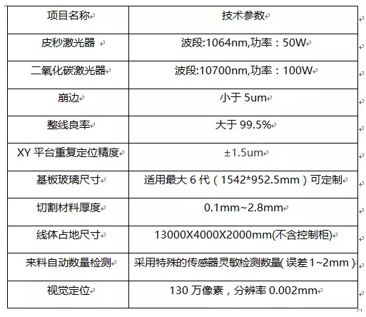 整條線體(ti) 配備一台開料及切割機、兩(liang) 台激光裂片機、一台分揀機並采用6軸機械手上下料及分揀,由A,B,C,D,E,F共7個(ge) 工站組成,實現從(cong) 基板整框來料到成品分揀到成品框,全程全自動不需要人工作業(ye) ,基板玻璃適合最大6代線,玻璃厚度0.1~2.8mm ,玻璃的利用率可高達97%以上。