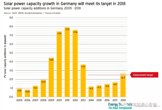 德國太陽能光伏曾經有過大躍進的年代,2009年新增裝機4.5吉瓦,2010-2012年連續三年新增裝機超過7吉瓦。此後,隨著補貼政策的調