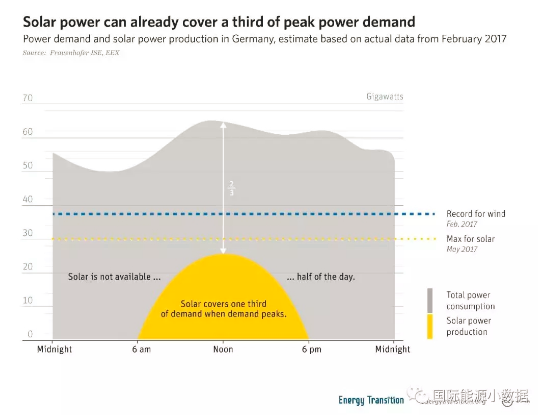 盡管2017年德國太陽能發電不到總發電量的7%,但它已經對電力係統結構產生了重大影響。在光伏峰值輸出時間,高達40%的德國電力混合可以來自太陽能電池板,極大地影響了供應量的平衡並且擾亂了長期的商業模式。據究機構FraunhoferISE稱,太陽能光伏電池組的輸出特性和通常的電力需求模式非常匹配,以至於過於缺乏靈活性以應對短期波動的老煤電廠在經濟上變得不可行。