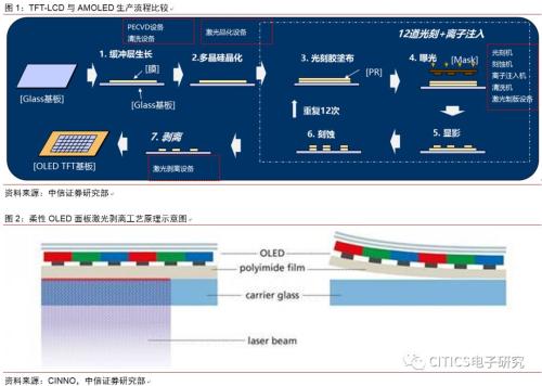 激光剝離環節從(cong) 載玻片分離PI薄膜後固化形成柔性屏。從(cong) LTPS的製造流程看,主要包括緩衝(chong) 層有源層生長(主要采用PECVD和清洗設備)、多晶矽晶化(主要采用激光晶化設備)、12道光刻+離子注入(主要采用光刻機、刻蝕機、離子注入機、清洗機、激光製版設備)三部分工藝。其中OLED硬屏和柔屏的主要工藝區別在於(yu) 柔屏使用了激光剝離設備進行玻璃與(yu) 基材的分離:柔性OLED麵板使用聚酰亞(ya) 胺(PI)基材,薄膜型基材通過將PI樹脂塗布在載體(ti) 玻璃上並通過PI固化設備施加高溫來製備形成,然後通過在該薄膜基底頂部蒸鍍上RGB像素,通過前端處理及用LLO設備照射激光來分離載體(ti) 玻璃和PI膜。