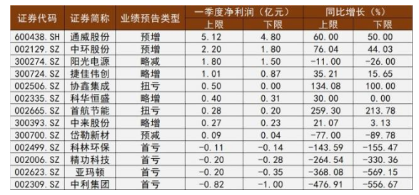 通威股份預測一季度盈利4.80億元至5.12億元,同比增長50%至60%;中環股份則預計盈利1.8億元至2.2億元,同比增長44%至76%。此外,組件巨頭協鑫集成(002506.SZ)則有望實現扭虧,預計盈利0至0.5億元。
