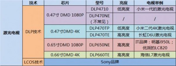 激光電視與(yu) 液晶電視一樣,無一例外需要芯片的支撐才是質量的保障。芯片的選擇上,幾乎所有激光電視是使用DLP技術的DMD芯片,它主要分為(wei) 四個(ge) 尺寸:0.47寸DMD 1080P,0.47寸DMD 4K,0.65寸DMD 1080P和0.66寸DMD 4K,不同芯片的型號也決(jue) 定了投影的性能。