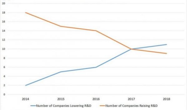 不過值得注意的是,盡管整體研發支出在增長,但降低研發支出的公司數量卻也在不斷增加。2014年隻有兩家公司降低了研發支出,2017年有10家公司相比上年減少了開支,2018年,11家企業降低了研發支出,這是首年降低研發支出的企業多於增加研發支出的企業。