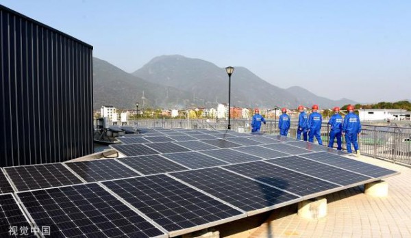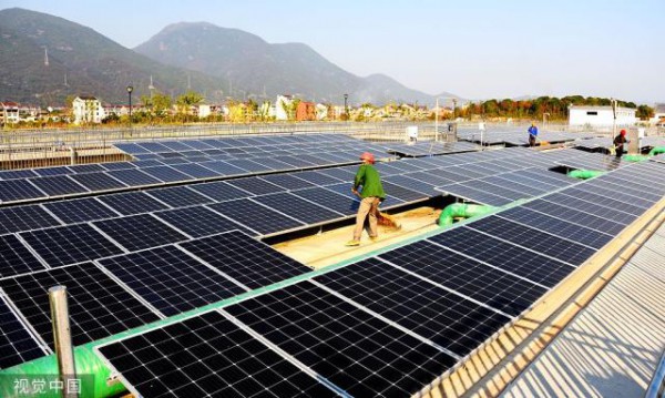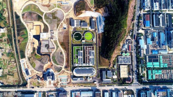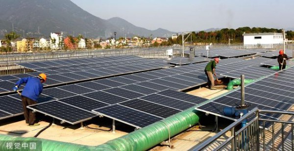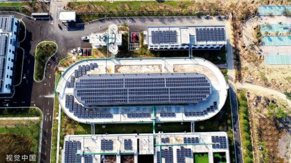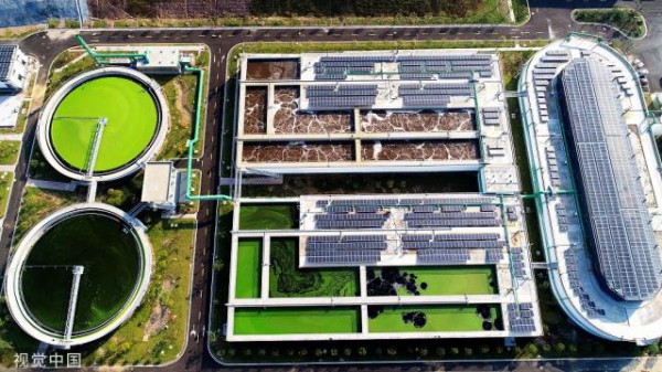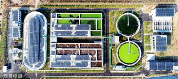 2019年11月11日,浙江台州,在仙居縣樂(le) 安環保能源公司,鳥瞰汙水處理池上一排排藍色的光伏板在太陽照射下發出幽藍色的光(無人機