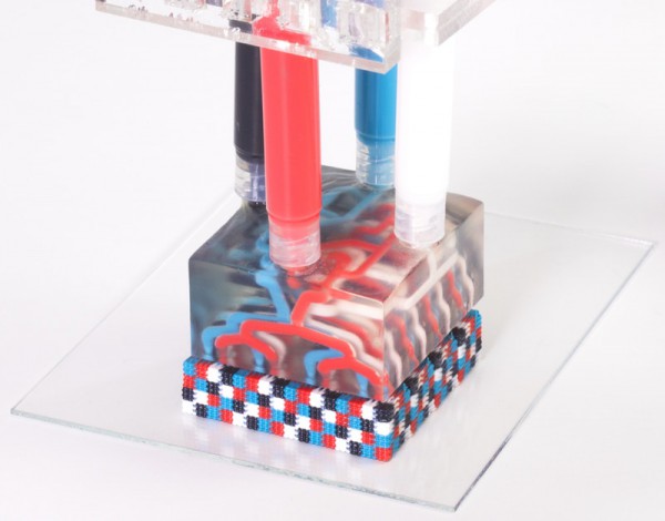 噴頭可以容納多個(ge) 噴嘴,每個(ge) 噴嘴最多可以打印八種不同的材料。一係列分支通道將“墨水”分配給噴嘴。