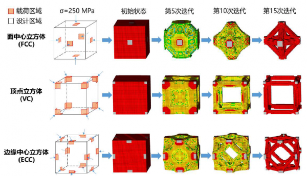 圖3 三種多孔網格結構的拓撲優(you) 化迭代過程