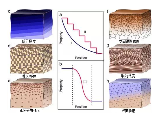 圖6 功能梯度材料中局域性能與(yu) 位置的關(guan) 係以及天然生物材料中的基本功能梯度設計形式與(yu) 原則