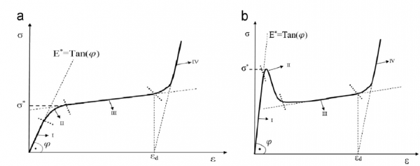 根據多孔結構的壓縮曲線的特征又可以分類為拉伸主導型多孔結構和彎曲主導型多孔結構。根據壓縮曲線特征可分為四個區域:彈性區域(I),彈塑性崩潰(II),塑性崩潰或不穩定的應力區域(III)和致密化(IV)區域。彎曲主導型的多孔結構壓縮曲線有應變硬化趨勢,而拉伸主導型多孔結構的壓縮曲線在達到第一抗壓強度峰值後回落形成應變軟化區域。