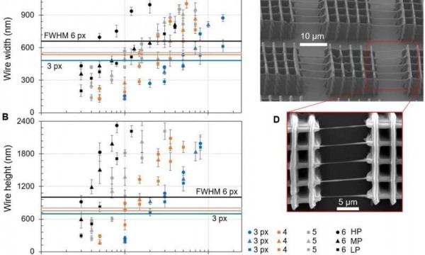 圖2.打印納米線展示了FP-TPL的納米級分辨率。 (A)在不同條件下打印的懸浮納米線的寬度(沿橫向)和(B)高度(沿軸向)。投影的DMD模式的線寬從3像素更改為6像素,固定周期為30像素。每個像素(px)映射到151 nm的投影圖像中。標簽HP、MP和LP分別表示高(42 nW / px),中等功率(39 nW / px)和低功率水平(35 nW / px)。特定形狀的所有標記表示以相同的功率級別生成的數據點,並且特定顏色的所有標記表示相同的線寬。使用中心波長為800 nm,標稱脈衝寬度為35 fs的飛秒激光和60×1.25數值孔徑的物鏡進行打印。 (C和D)懸浮納米線特征的掃描電子顯微鏡圖像。